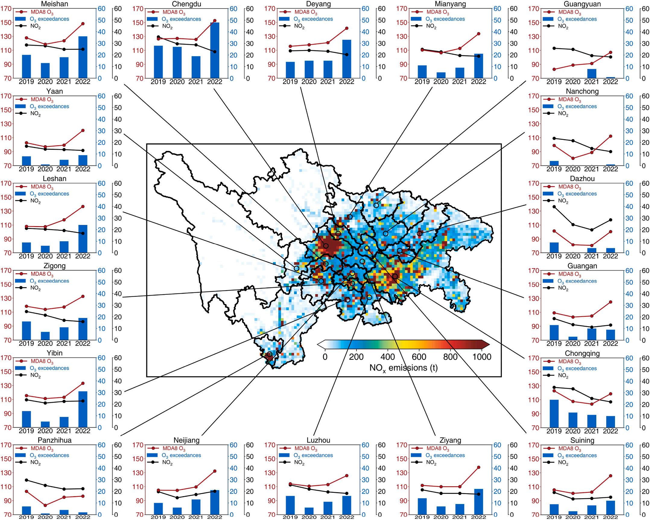 图1.(主图)0.1°×0.1°网格尺度的四川盆地氮氧化物年排放总量分布图,(周围图)2019-2022年四川盆地近地面观测的夏季二氧化氮平均浓度(黑色)、日最大8小时臭氧浓度(红色)及超标天数(蓝色柱状图)