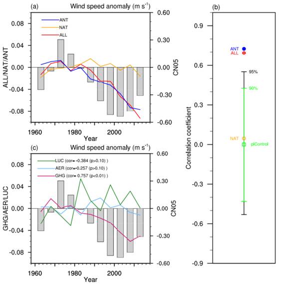 青藏高原被誉为“世界屋脊”,也是我国风能资源较为丰富的地区之一。风速的变化不仅影响风能开发潜力,还对区域水文循环、生态系统和地表过程产生深远影响。近年来,青藏高原风速持续下降的现象引起了广泛关注,但其背后的物理机制和人为因素的贡献尚不十分明确。研究团队利用中国高分辨率格点观测数据集(CN05.1)和10个CMIP6全球气候模式数据,采用基于相关性的检测归因方法和多元线性回归模型,定量评估了不同外部强迫对青藏高原风速变化的贡献。研究发现,1961–2014年期间,青藏高原年均近地表风速以每十年−0.116m/s的速度显著下降,且这一趋势在全区范围内高度一致。归因分析表明,人为强迫(ANT)对观测到的风速下降贡献了−0.605m/s,几乎解释了全部下降幅度(−0.628m/s),而自然强迫(NAT)的影响几乎可忽略。在人为强迫中,温室气体(GHG)是导致风速下降的最主要因素(贡献−0.628m/s),而气溶胶(AER)和土地利用变化(LUC)的贡献较小,甚至在一定程度上抵消了部分下降趋势。进一步开展的机制分析表明,温室气体排放导致青藏高原北部中高纬度地区增温幅度大于南部,进而引起500 hPa位势高度场的南北梯度减弱,削弱了驱动地表风的气压梯度力,最终导致风速下降。研究同时指出,当前CMIP6模式虽能定性再现风速下降趋势,但普遍低估其幅度,反映出复杂地形区气候模拟仍存在挑战。未来需结合高分辨率动力降尺度等手段,进一步提升区域气候预测的可靠性。该研究深化了对青藏高原气候变化机制的理解,也为我国风能资源评估提供了科学依据。