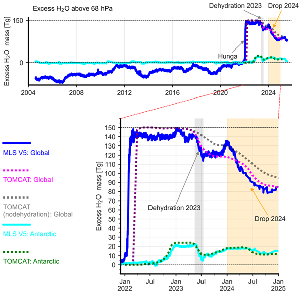 图1 2024年至2025年初,全球平流层水汽总质量出现大幅下跌。(实线:MLS卫星观测,虚线:全球三维化学传输模型TOMCAT模拟。)