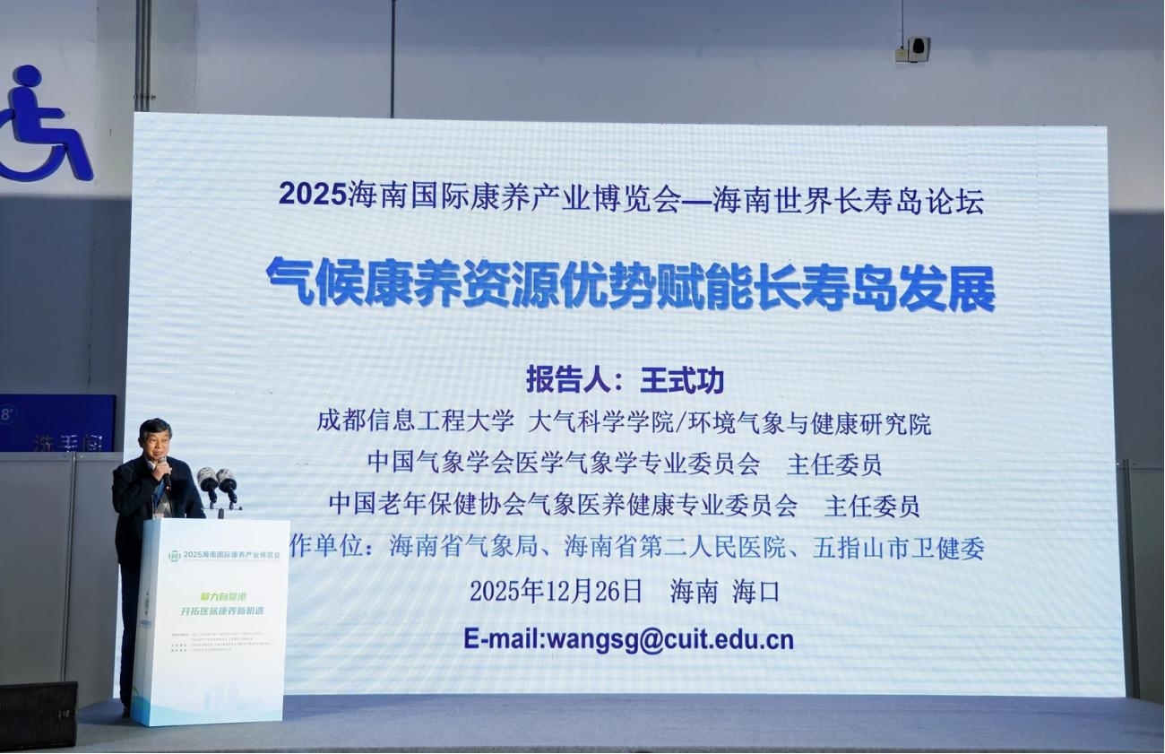 、联合国老龄所及海南省相关厅局的专家领导同台发表主旨演讲。王教授作了题为“气候康养资源优势赋能长寿岛发展”的报告,系统梳理了中国长寿之乡空间分布特征,深入阐释“天人相应”的生态哲学内涵与实践表现形式,结合海南独特的气候禀赋,深入探析其气候康养资源优势,通过剖析气候条件与区域长寿现象之间的内在关联,为海南发挥其生态气候资源优势、打造世界级长寿康养目的地提供了科学依据。